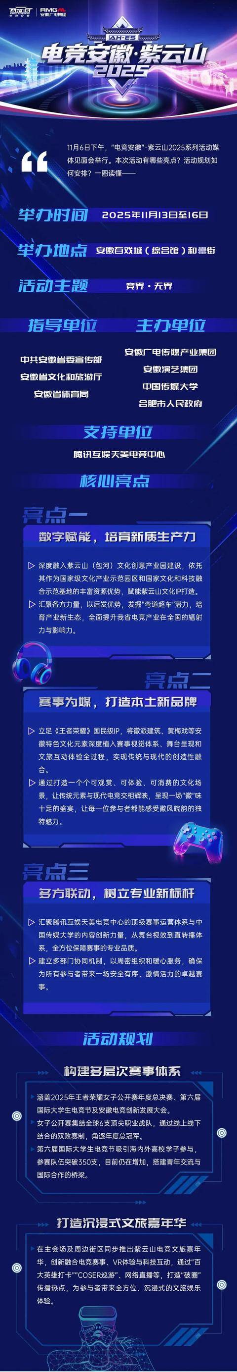 该活动是我省即将举办的首个高规格、综合性电竞赛事,由省委宣传部、省文化和旅游厅、省体育局指导,安徽广电传媒产业集团、安徽演艺集团、中国传媒大学、合肥市人民政府联合主办。该活动将立足王者荣耀国民级IP,将徽派建筑、黄梅戏等安徽特色文化元素深度植入赛事视觉体系、舞台呈现和文旅互动体验全过程,实现传统与现代的创造性融合。