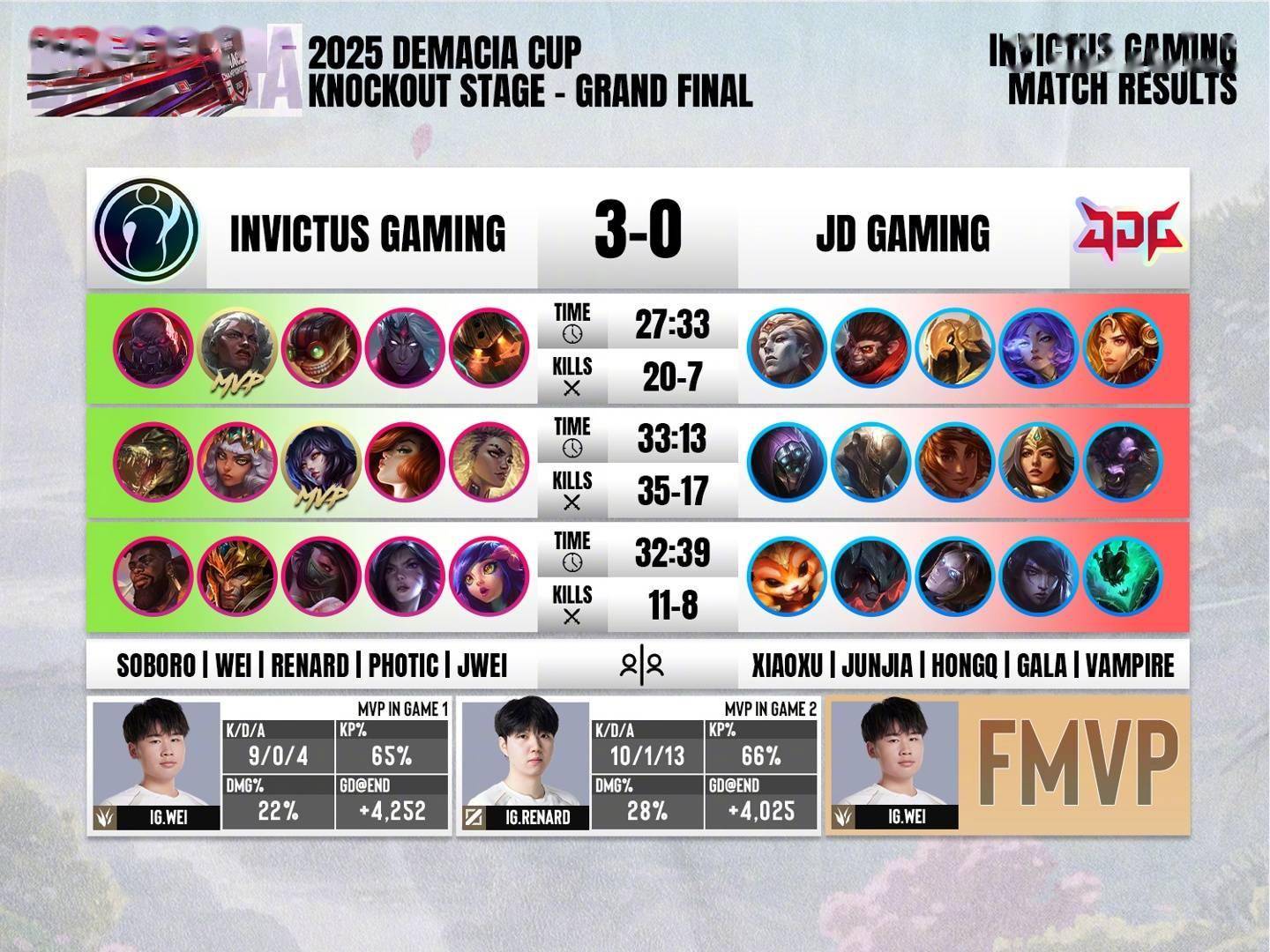 iG 在 S15 全球总决赛后对《英雄联盟》战队进行了大规模的人员重组和轮换,出战本项赛事的选手中仅有一位在上赛季的队伍之中。而 iG 的新阵容在德玛西亚杯的淘汰赛阶段中展现了相当不错的统治力,三场 BO5 仅失一局。