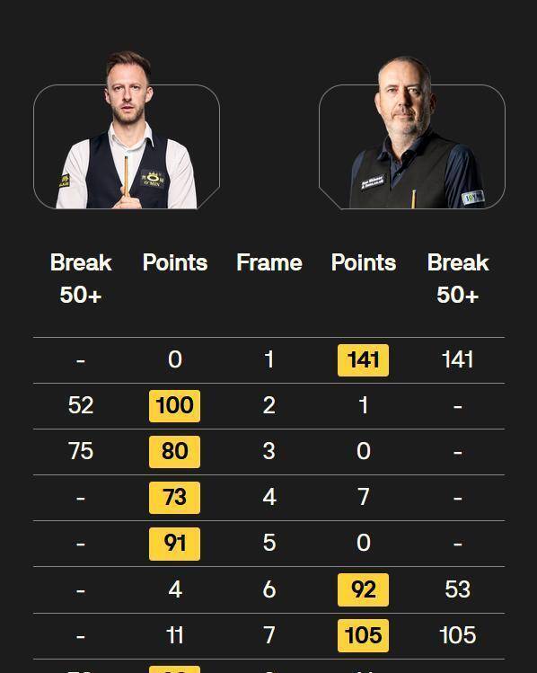 特鲁姆普连赢三局,以3比1反超进入中场休息。 休息回来,他再胜一局,将比分扩大为4比1。 其中第五局出现罕见一幕:特鲁姆普手握91分领先(威廉姆斯被罚了二十多分),台面还剩83分时,威廉姆斯就直接认输了。 这在职业比赛中极为少见。