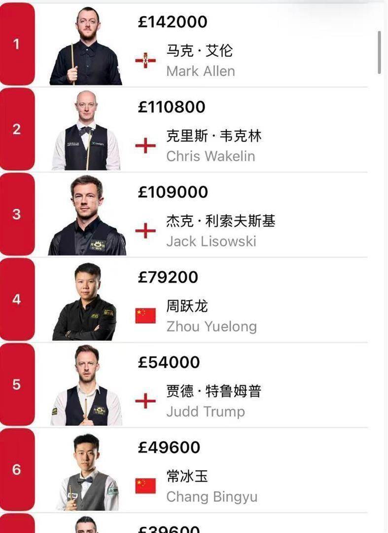本赛季前三站比赛结束后,北爱尔兰名将马克·艾伦以14.2万英镑高居奖金榜榜首。他在英格兰公开赛决赛中9比8绝杀周跃龙夺冠,又在苏格兰和北爱尔兰两站赛事中都打进了半决赛。目前,他领先第二名克里斯·韦克林超过3万英镑,优势非常明显。
