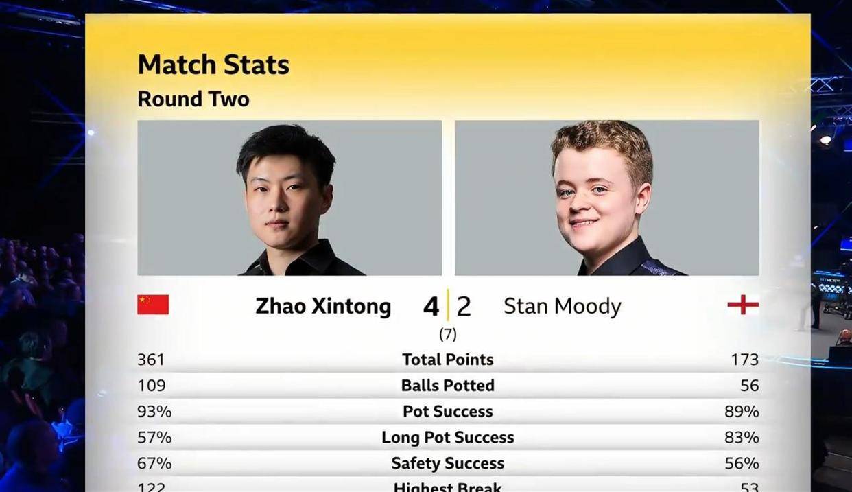 全场比赛的技术统计清晰地反映了双方的差距。 赵心童轰出了一杆破百(122分)和三杆50 (83分、54分、55分),而穆迪仅有一杆53分的表现。 在总得分、进球成功率等关键数据上,赵心童都占据了明显优势。