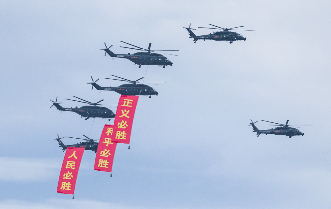 3 架直升机悬挂“正义必胜”“和平必胜”“人民必胜”的条幅,向全世界昭告正义必胜、和平必胜、人民必胜。▼
