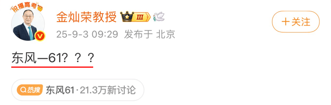 连大名鼎鼎的国际问题专家金灿荣教授,都发出了灵魂拷问,被网友锐评:中式阅兵有史以来第一次实现军迷军盲平等。▼